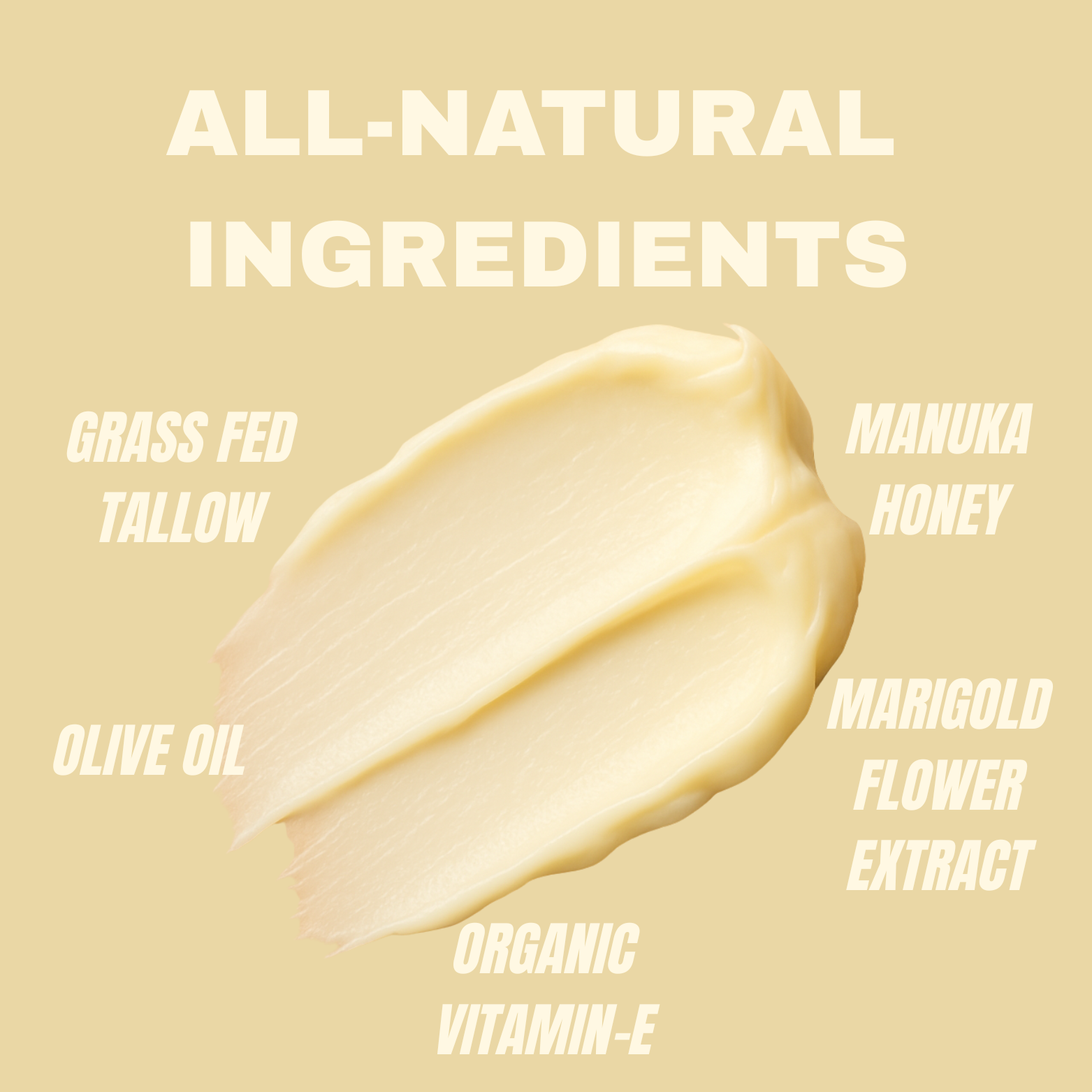 This balm features a unique blend of grass-fed beef tallow, Manuka honey, cold-pressed olive oil, Vitamin E, and Marigold Flower Extract. These ingredients are chosen for their health benefits—nourishing, hydrating, and healing properties that effectively support your skin's well-being without harmful additives.